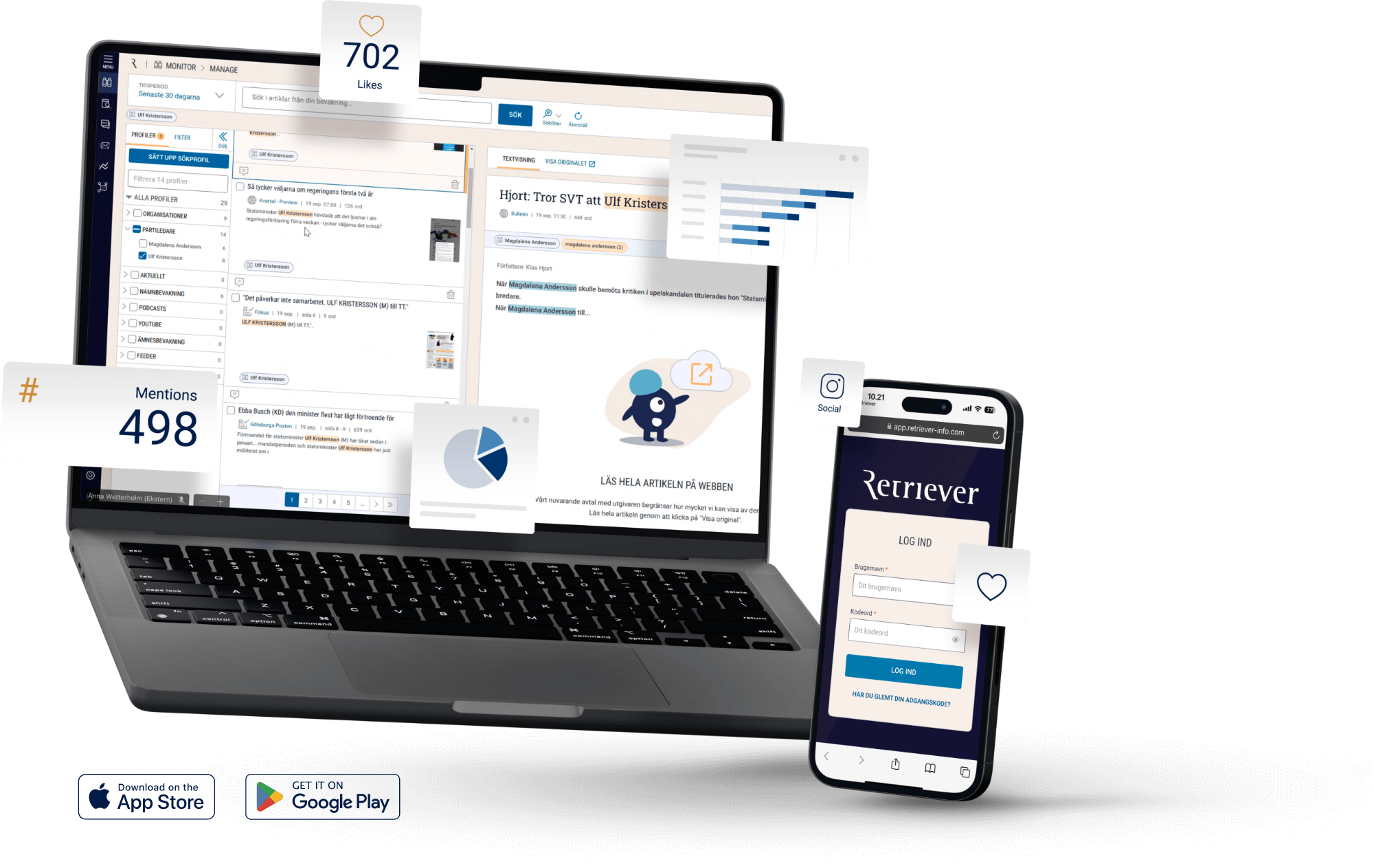 Velger du medieovervåkning fra Retriever, kan du også få tilgang til en egen app med mulighet for varslinger på mobilen det øyeblikket en ny, viktig artikkel dukker opp. Slik kan du holde deg 100% oppdatert, også når du er på farten.